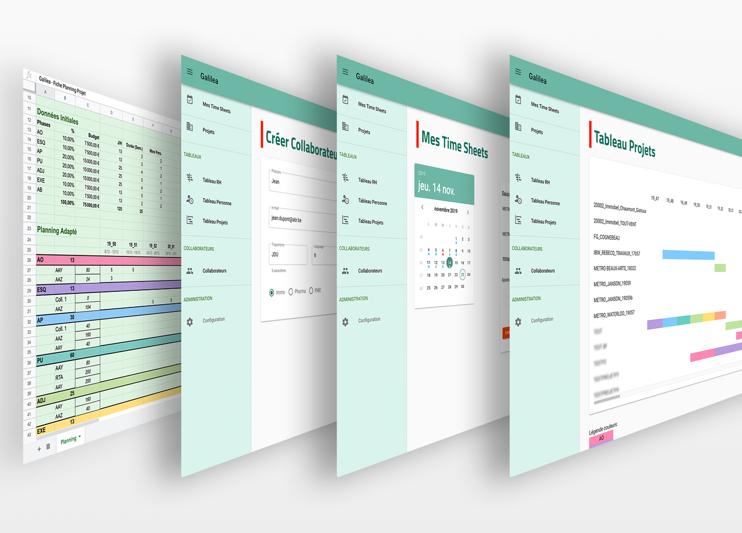 Galilea is a Planning and Timesheets application realised for the "ABR Architecture" agency. The core component of the app is a Cloud Firestore database which contains all data about projects, plannings, timesheets, employees and teams. Each Project plan is defined via a Google Sheet which implements a Gantt chart and connects to the database to save planning data and to fetch other projects and timesheets data (to visualize the total workload of each employee).