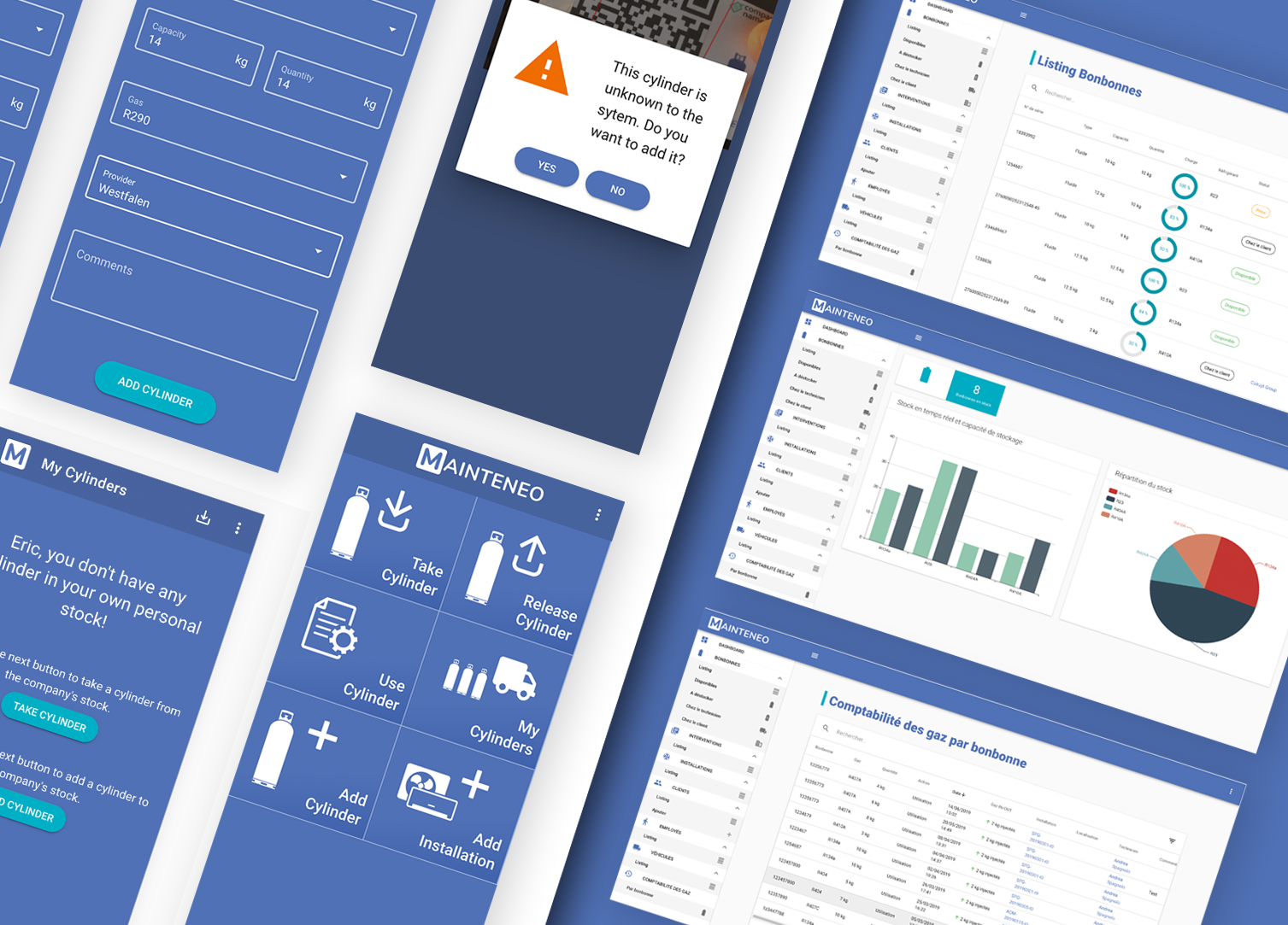 A desktop web application which presents a global dashboard on gas inventory (types, inventory levels, etc.), a tracking of the gas tanks (at customer site, in trucks, etc.), different visualizations of the interventions (by customers, by technician,etc.) and automates the reporting on use of fluorinated gases requested by the F-GAS European directive.